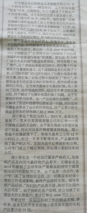 2018年8月27日本公司職工周小榮被評(píng)為制造精品的“領(lǐng)頭羊”. 多年來(lái)周小榮師傅作為公司補(bǔ)償器精品班長(zhǎng),帶領(lǐng)一班人,為公司承接制造大型、復(fù)雜、特殊用途和特種材料的補(bǔ)償器做出了貢獻(xiàn),是大家學(xué)習(xí)的榜樣。 詳見(jiàn)2018年8月27日江南晚報(bào)第七版。